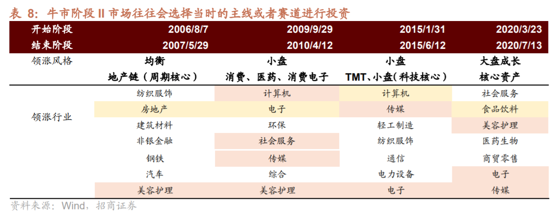 牛市II阶段风格和行业特征:新抱团的方向。牛市阶段II,容易出现增量资金的正反馈和资金的“抱团”,市场往往会选择当时的主线或者赛道进行投资。从当前市场空间的角度来看,满足市场空间大、渗透率低、加速提升的方向包括AI硬件及应用,人形机器人,固态电池,信创半导体国产化,可控核聚变,军贸出海,新消费。