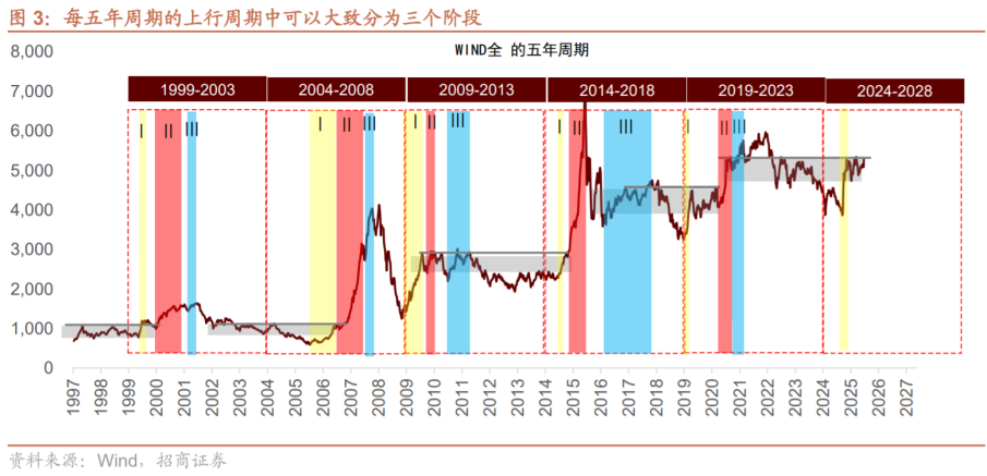回顾市场五年周期牛市三阶段论:成因与逻辑。中国经济和资本上的政策,有一个相对隐性5年周期规律,每一轮上行周期可以大致分为触底逆袭、突破上攻和背驰上涨三个阶段。