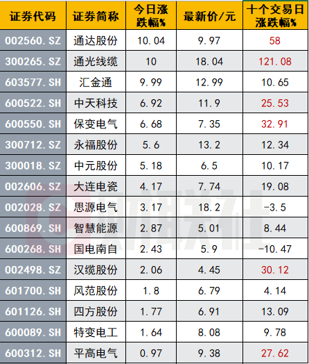 其中,通光线缆近十个交易日股价走势表现惊人,涨幅超120%。近十个交易日,通达股份累计涨幅达58%;汉缆股份、保变电气、平高电气和中天科技等累计涨幅均超过25%。