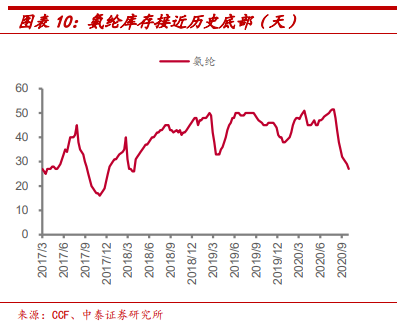 氨纶方面,氨纶库存由7月底高点51 天下降至目前 27 天。目前价格及价差仍处于行业底部区间,但根据华瑞信息,自 10 月 15 日起,行业龙头华峰氨纶将所有规格氨纶价格上调 2000 元/吨,预计行业价格及价差将进入上行周期。