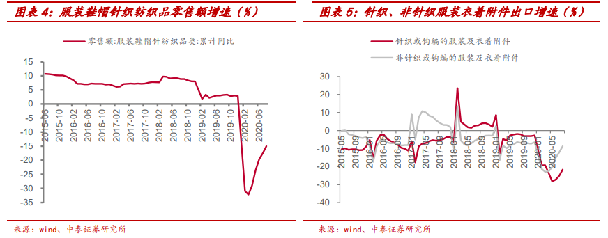 受疫情影响,纺织行业年内需求均较为低迷,上半年服装零售额同比下滑 19.60%,针织及非针织出口额下滑 27.30%和 15.20%。 目前行业底部向上态势明显,8 月份单月国内服装零售额同比增长4.8%,针织及及非针织出口额分别上升3.16%和 12.66%。