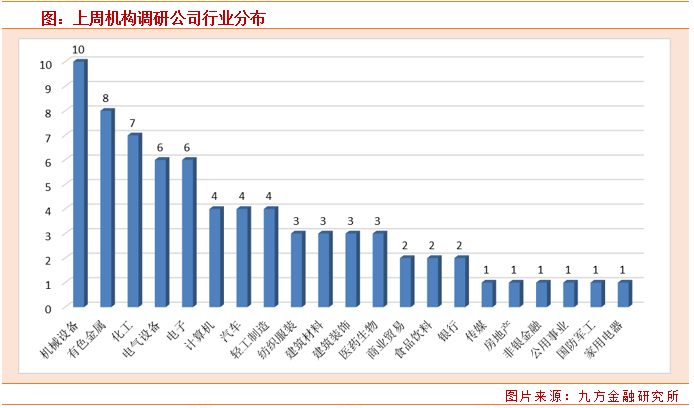从行业分布来看,上周机构重点挖掘了机械设备行业,有10家公司获得机构关注,其次为有色、化工、电子和电气设备。但从机构调研家数角度来看,还是消费相关的公司数量靠前。