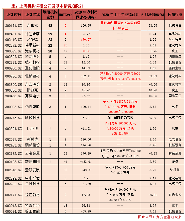 从业绩来看,其中8家公司披露上半年业绩预计,其中4家公司预增。劲胜智能(电子)业绩亮眼,预计净利润1.48亿元~1.52亿元,同比增长990%~1020%;北新建材(建筑材料)其次,预计净利润约5亿元~7.5亿元,增长172.31%~208.47%;东富龙(机械设备)预计累计净利润将比上年同期增长50%以上;比亚迪(汽车)预计净利润同比增长10%~23.75%。