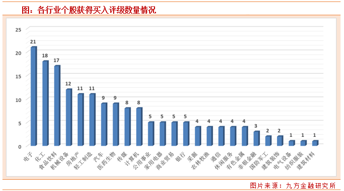 梳理近5日机构发布研报并给出买入评级的公司,共有123家。行业分布方面,电子行业个股获得21次买入评级,数量居首;随后是化工、食品、机械行业,分别获得18、17、12次买入评级。