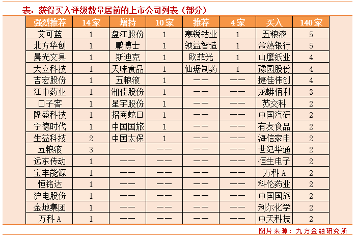 个股来看,共有13家上市公司获得强烈推荐的评级,分别是艾可蓝、北方华创、晨光文具、大立科技、吉宏股份、江中药业、口子窖、隆盛科技、宁德时代、生益科技、五粮液、远东传动、宝丰能源、恒铭达、沪电股份、金地集团、万科A。其中五粮液还获得1家券商的增持评级和另外5家券商的买入评级。