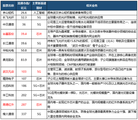 券商提示可重点关注湖北主导的新旧基建相关的产业。其中新基建同湖北重合的包括5G通信、集成电路、激光、医药生物等细分领域,老基建可关注水泥、建筑工程与装饰等细分领域。