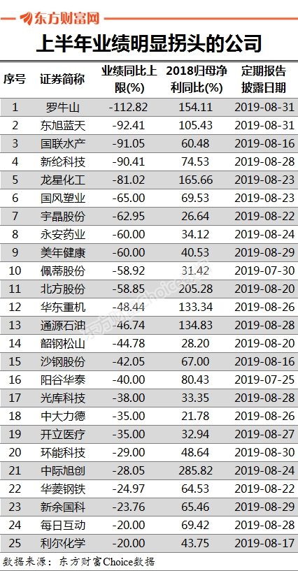 拐头最明显的当属罗牛山了,其在2016年净利同比增31.3%,2017年同比增91.5%,2018年同比增154.1%的情况下,今年上半年至少亏损4300万元,归母净利润同比至少下滑112.8%。其本月下跌7.21%,同期沪深300下跌0.15%。此外,东旭蓝天、国联水产、新纶科技和龙星化工4家公司,在今年上半年业绩拐头幅度也超过80%。