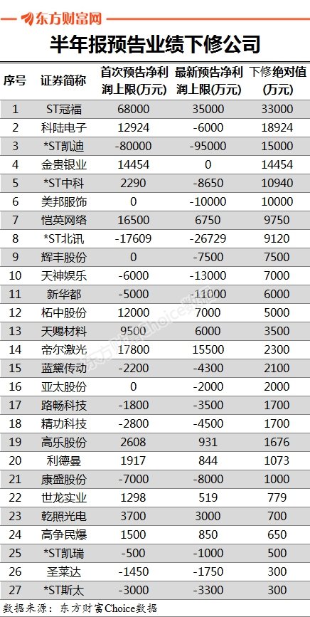 下修最明显的当属ST冠幅,其首次披露预告时表示上半年最多可以盈利6.8亿元,可最新预告只最多盈利3.5亿元,足足少了3.3亿元。其次是科陆电子,其首次预告最大盈利为1.29亿元,而最新预告却至少要亏6000万元,两者相差1.89亿元。