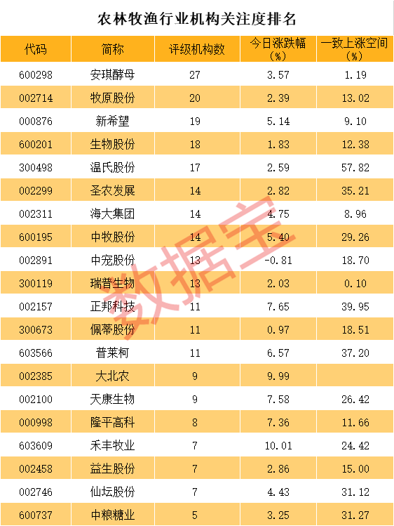 除了概念的刺激,上述板块的良好表现,还有在全球大放水背景下抗通胀的预期刺激,以及经济不确定性下的抗风险能力强。以机构关注度来看,安琪酵母、牧原股份等个股是农林牧渔行业机构关注度