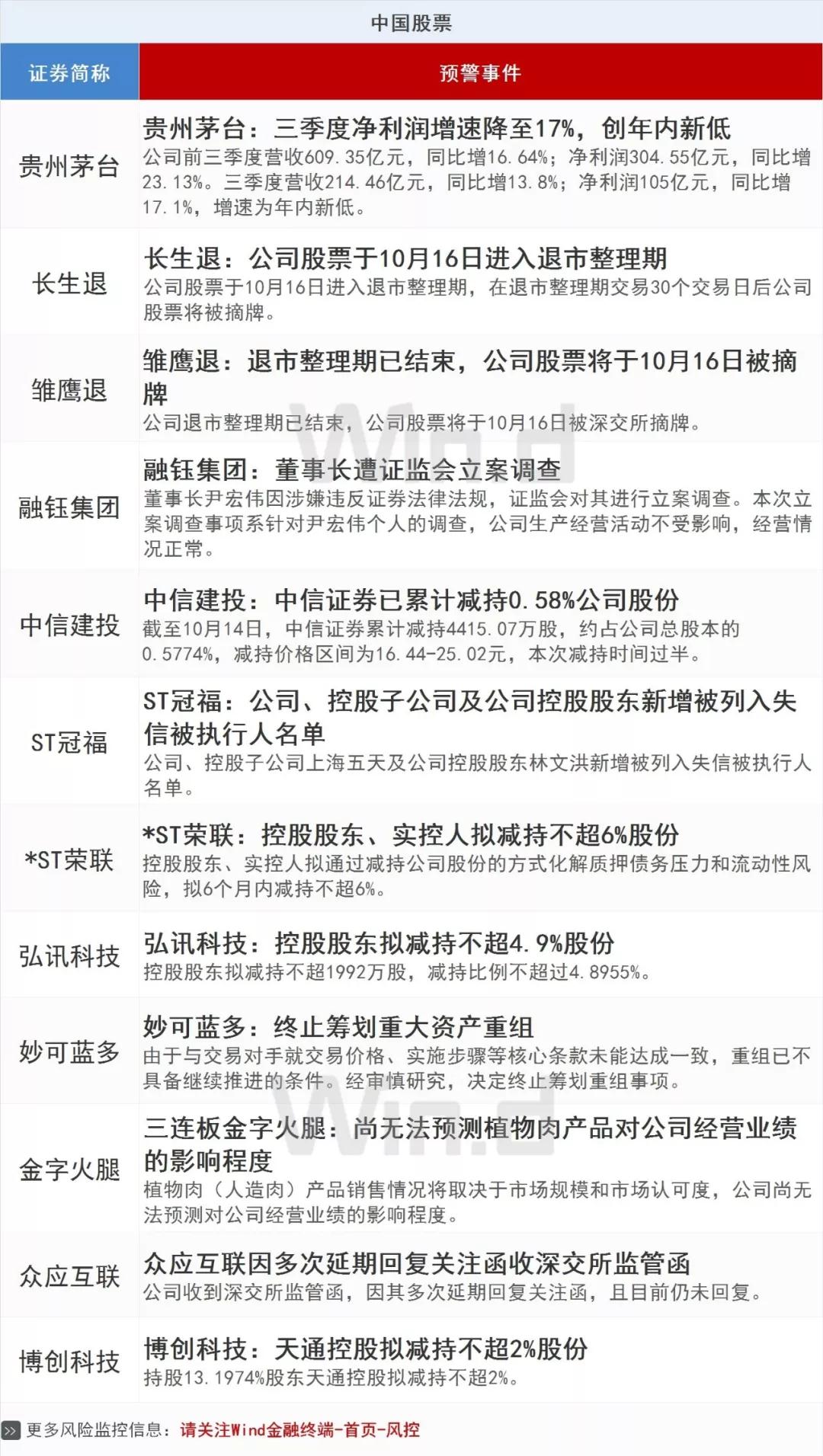 每日投资预警 | 贵州茅台三季度利润增速大幅下降!