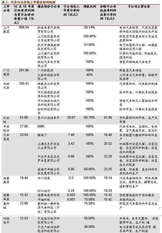 招商证券认为,此次分拆上市的规则出台将为中国资本市场深化改革添上浓墨重彩的一笔。对于汽车产业而言,恰逢行业进入成熟期,下游整车企业竞争愈发激烈、中游零部件企业在“三化”转型道路上不断摸索。分拆上市制度将对行业中的优质龙头企业产生积极深远的影响。建议关注存在潜在分拆上市子公司的优质龙头企业,整车方面建议关注上汽集团、广汽集团、长城汽车、比亚迪,零部件方面建议关注中鼎股份、均胜电子、拓普集团等。