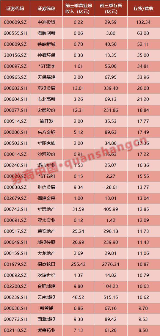 其次是存货占比较高的上市公司亦值得关注。在这里面,地产公司可能情况较为特殊,但非地产类企业若存货超过主营收入,那就需要好好研究一番。