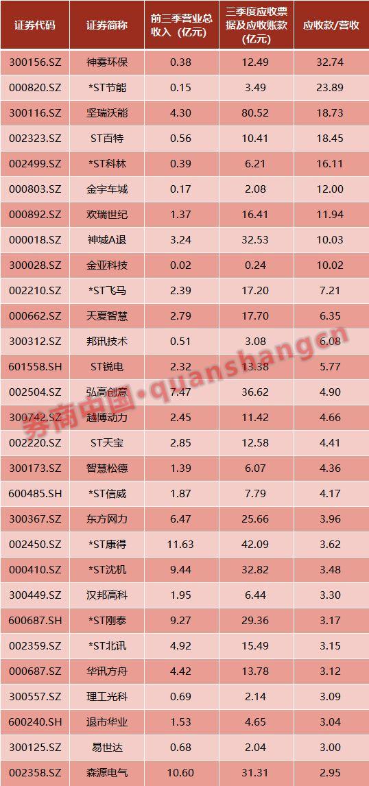 第三类是应收账款占比较高的公司。从三季报的情况来看,A股市场总共有446只股票的应收账款及应收票据总额与营业总收入之比超过1,其中神雾环保、坚瑞沃能、ST百特等应收账款巨大,且远远超过应收账款,这些股票已经爆过雷。还有一些没有爆过雷的企业,亦需重点关注。