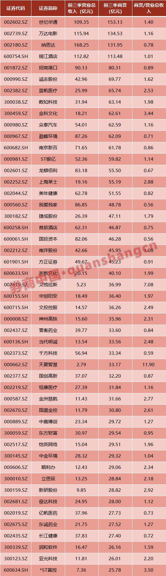 首先商誉奇高的上市公司可能需要在业绩披露期回避。根据Wind资讯数据,下列公司商誉规模较大,相对营收的比值比较高,若计提减值可能会对上市公司业绩带来冲击。当然,并非所有列示的公司都会有商誉减值的情况出现,但仍值得甄别和留意。