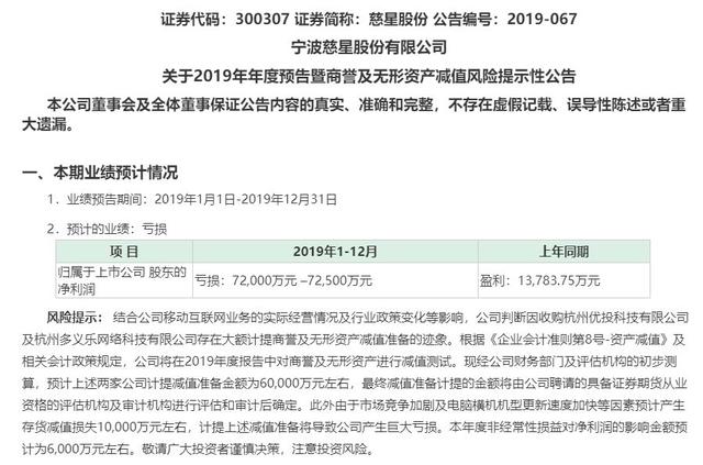 根据慈星股份公告,结合该公司移动互联网业务的实际经营情况及行业政策变化等影响,该公司判断因收购杭州优投科技有限公司及杭州多义乐网络科技有限公司存在大额计提商誉及无形资产减值准备的迹象。根据《企业会计准则第8号-资产减值》及相关会计政策规定,该公司将在2019年度报告中对商誉及无形资产进行减值测试。现经财务部门及评估机构的初步测算,预计上述两家公司计提减值准备金额为60000万元左右,最终减值准备计提的金额将由公司聘请的具备证券期货从业资格的评估机构及审计机构进行评估和审计后确定。此外由于市场竞争加剧及电脑横机机型更新速度加快等因素预计产生存货减值损失10000万元左右,计提上述减值准备将导致该公司产生巨大亏损。本年度非经常性损益对净利润的影响金额预计为6000万元左右。