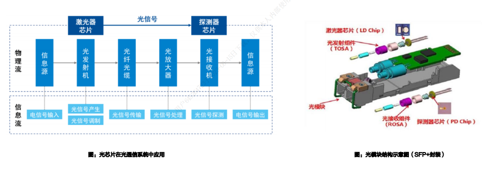 光芯片及组件是光模块中最大的成本项,其性能直接决定光模块的传输速率,是光通信产业链的核心之一。按功能光芯片可以分为激光器芯片和探测器芯片,在光通信系统传输信号过程中,激光器芯片主要用于发射信号,将电信号转化为光信号,探测器芯片主要用于接收信号,将光信号转化为电信号。