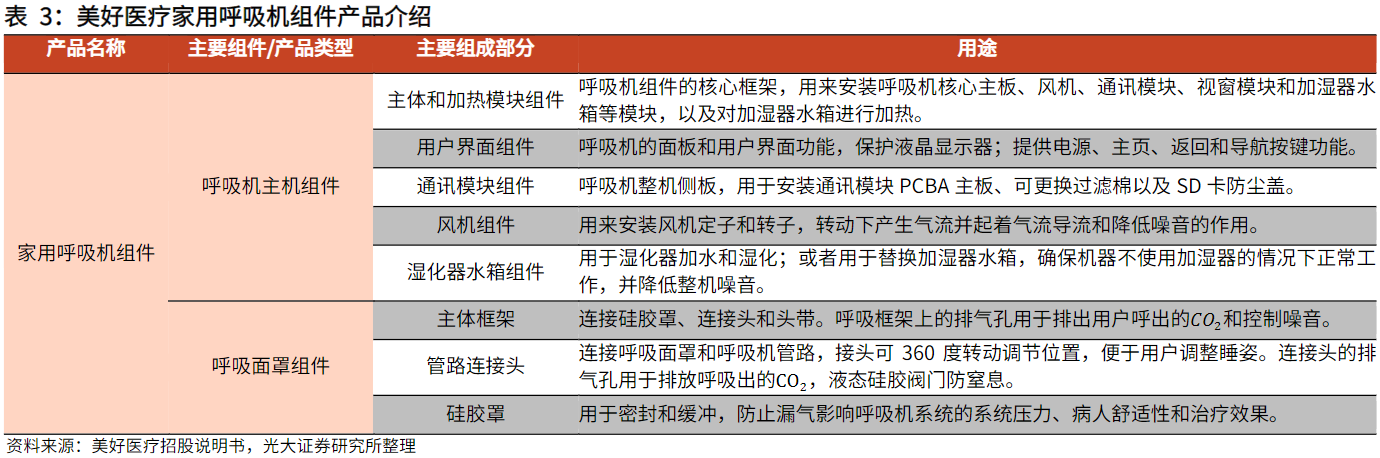 公司家用呼吸机组件业务处于产业链中上游,下游客户是呼吸机生产企业。公司家用呼吸机组件主要由呼吸机主机组件和呼吸面罩组件构成。其中呼吸机主机组件细分为主体和加热模块组件、用户界面组件、通讯模块组件、风机组件和湿化器水箱组件;呼吸面罩组件细分为主体框架、管路连接头和硅胶罩,在呼吸机组件和呼吸面罩组件领域多项核心技术处于行业领先水平。