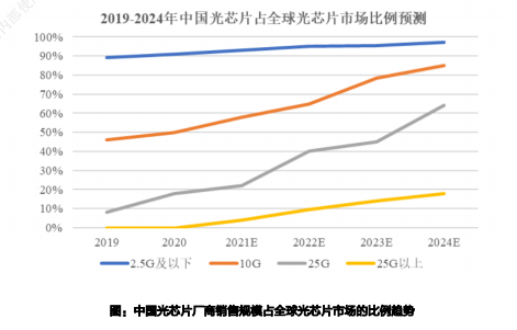 目前,中国光芯片厂商销售规模占全球光芯片市场的比例不断提升,中高速率光芯片增长更快。2.5G及以下光芯片市场被国内光芯片企业占据主要市场份额;10G光芯片我国企业已基本掌握核心技术,25G光芯片的国产化率约20%,但25G以上光芯片的国产化率仍较低约5%,当下以海外供应商为主。