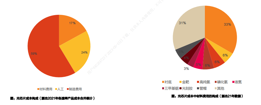 成本及技术壁垒分析来看,光芯片的制造成本中制造费用占比最高,良率决定各家能力。而光芯片的原材料包括衬底、金靶、特殊气体、三甲基铟、光刻胶、封装材料和其他材料等。其中,对于磷化铟衬底,机构预计到2026年全球光模块器件磷化铟衬底预计销量将超过100万片,对应市场规模将超1.57亿美元。