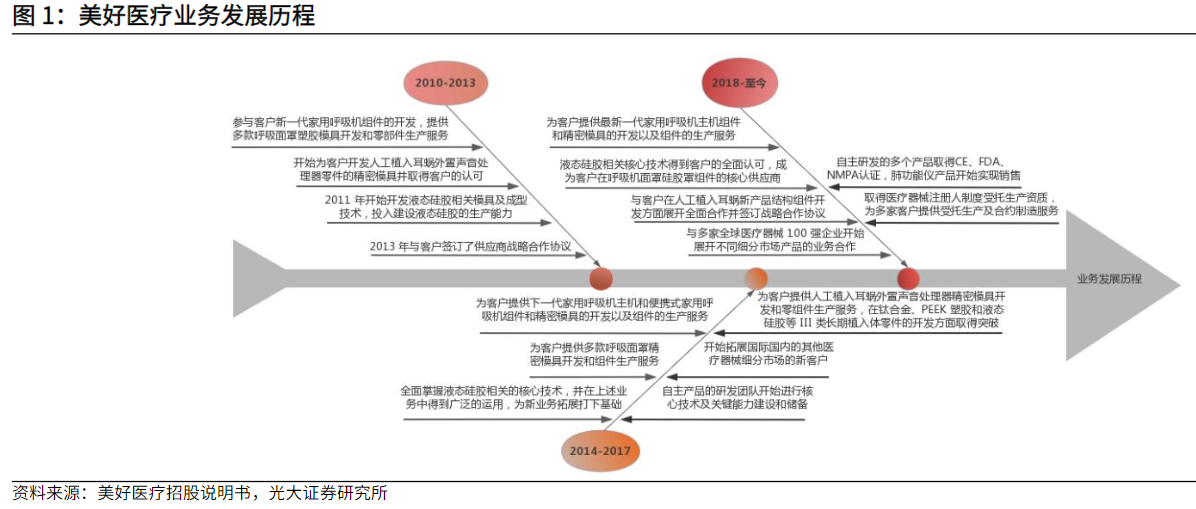 看点一:医疗器械组件制造龙头公司专注于医疗器械精密组件及产品的设计开发、制造和销售,目前的核心业务是家用呼吸机和人工植入耳蜗组件的开发制造和销售;同时也着力于自主医疗器械产品、健康防护类产品的研发、制造和销售;也是医疗器械注册人制度受托生产企业和合约制造商,为全球医疗器械客户提供医疗器械产品受托生产服务。