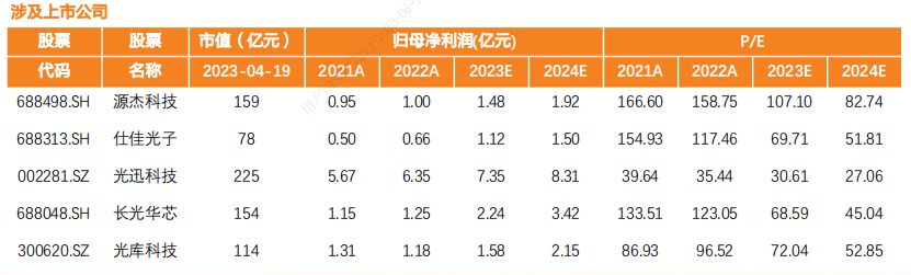 上市公司投资机会方面,源杰科技聚焦于光芯片行业,公司已实现向主流光模块厂商批量供货,产品最终成功应用于国内外知名运营商。另外,仕佳光子主营光芯片及器件、室内光缆、线缆材料三大板块。公司2.5G、10G激光器芯片处于可量产阶段,截止到22年6月25G激光器芯片正在客户的验证中。除此之外,还可以留意光迅科技、长光华芯和光库科技等业内头部企业的布局机会。