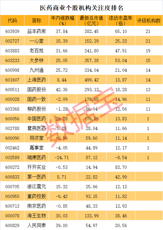大参林是另一只近期创出历史新高的医药商业股,今年股价上涨超25%。机构关注度方面,益丰药房和一心堂均有21家机构评级,老百姓、大参林、九州通等个股均有10家以上机构评级。其中,国药一致和柳药股份一致上涨空间均超过30%。