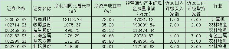 综合梳理上述三大财务数据,益生股份、万集科技、圣农发展、云海金属、牧原股份、仙坛股份等6家公司同时满足净资产收益率逾35%、净利润实现同比翻番以及经营性现金流为正值。其中,圣农发展、云海金属、牧原股份、仙坛股份、万集科技等5只个股更是被天风证券、光大证券等机构看高一线,近30日内,受到机构给予“买入”或“增持”等看好评级。