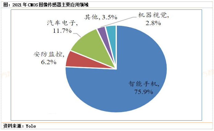 从下游应用领域来看,目CMOS图像传感器最大市场为手机摄像头,2021年CMOS图像传感器手机市场占比达到75.9%。从市场增速来看,汽车市场增长最快,2021年汽车CMOS市占率已经达到11.7%,随着电动车渗透率的上升,以及智能驾驶的发展,单车CMOS传感器的使用量也在大幅增长,2022年之后,CMOS图像传感器(CIS)汽车领域的增速是最大的,CIS已经成为高级辅助驾驶传感器系统的重要组成部分。