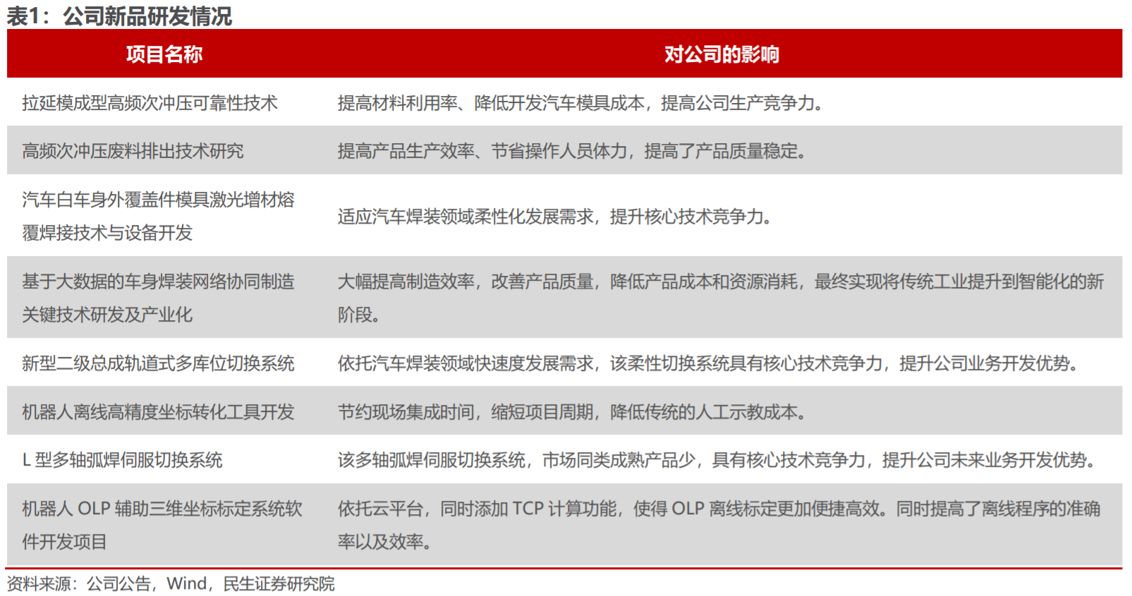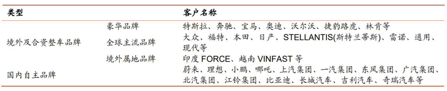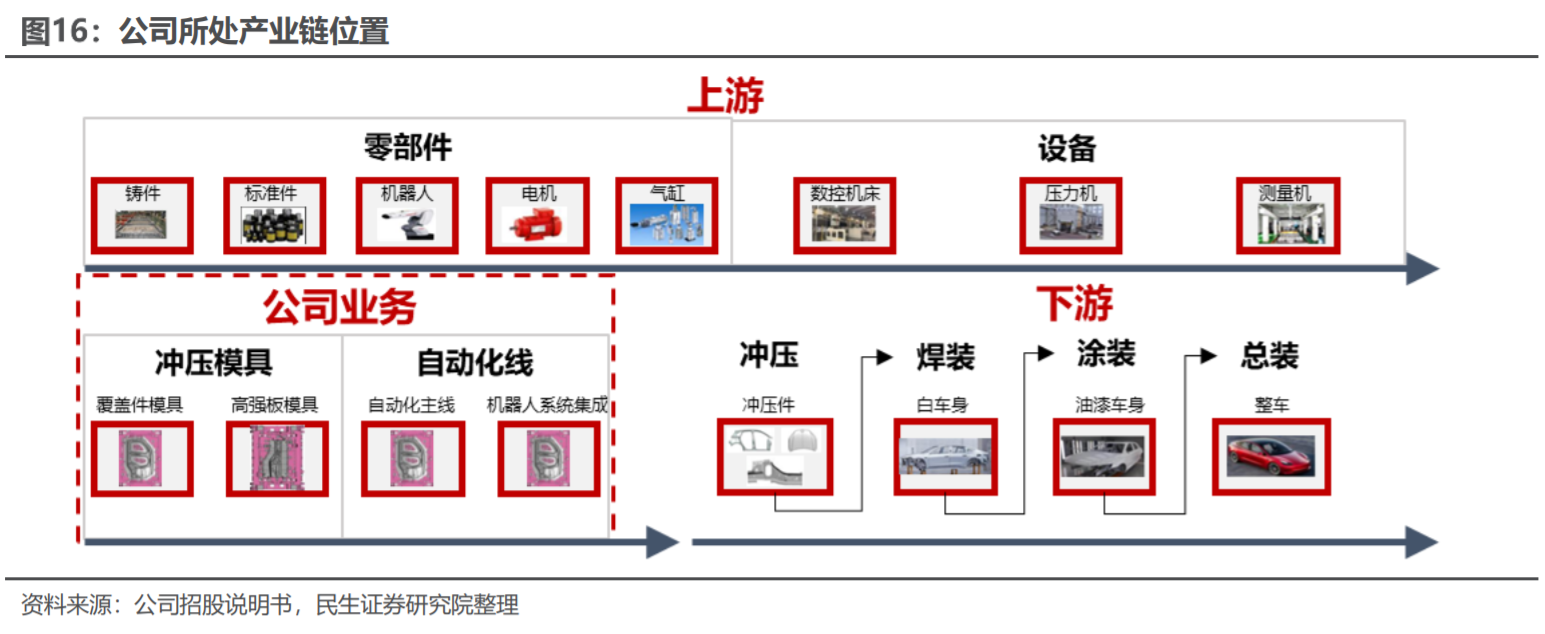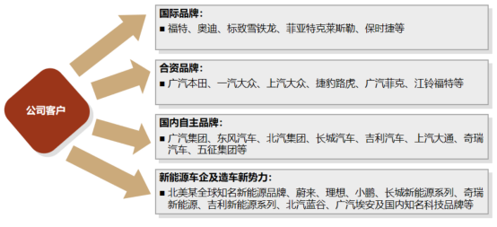 客户覆盖BBA、大众、本田、福特、通用等知名汽车厂商以及国内长城、吉利、奇瑞、广汽、红旗等自主品牌。公司在新能源汽车领域积极布局,围绕汽车白车身制造领域完成了轻量化车身成形装备、轻量化车身冲焊成套装备、智能制造及机器人系统集成三大业务布局,客户拓展至北美知名新能源、蔚来、理想、小鹏、广汽埃安等新能源品牌。