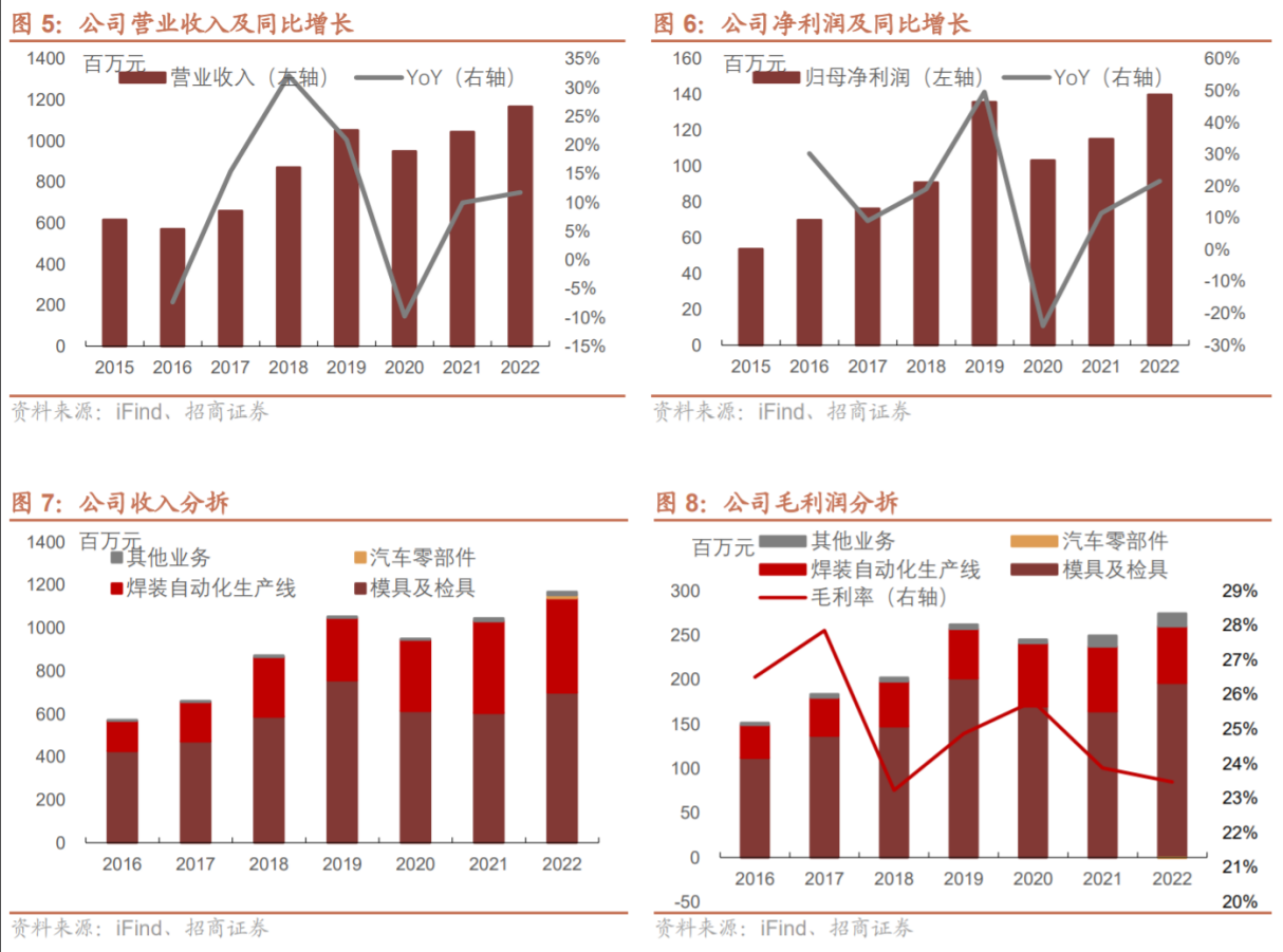 2022年模具及检具/焊装自动化生产线营收为7.0亿/4.4亿元,同比+15.8%/+2.5%。公司与奇瑞成立合资公司布局汽车轻量化零部件,包含一体化压铸、高压铸造,2023年开始放量,成为第二增长曲线。