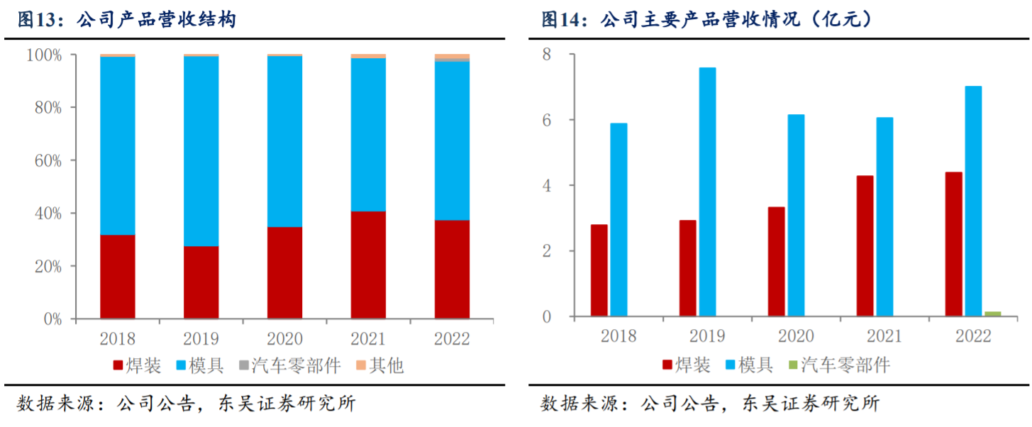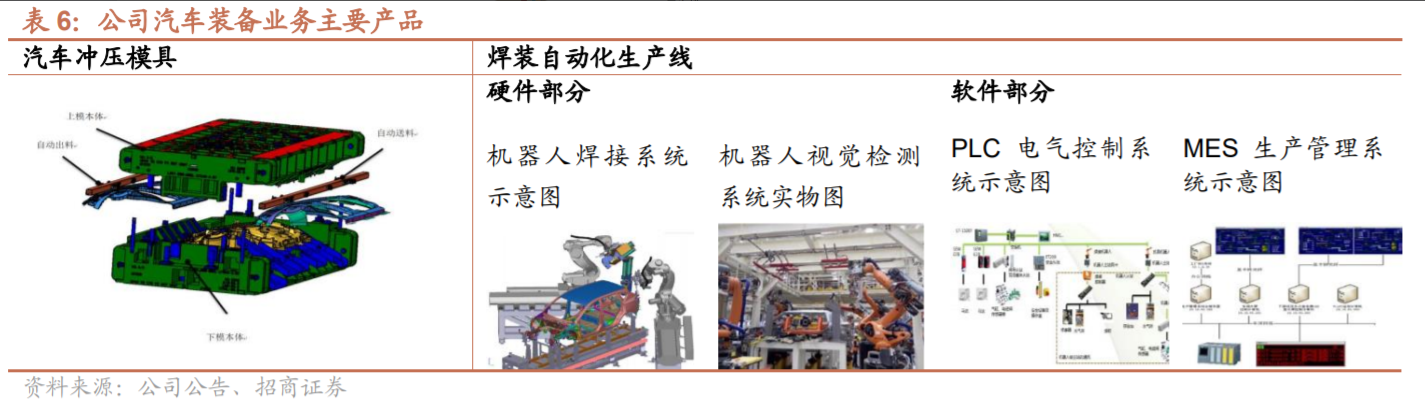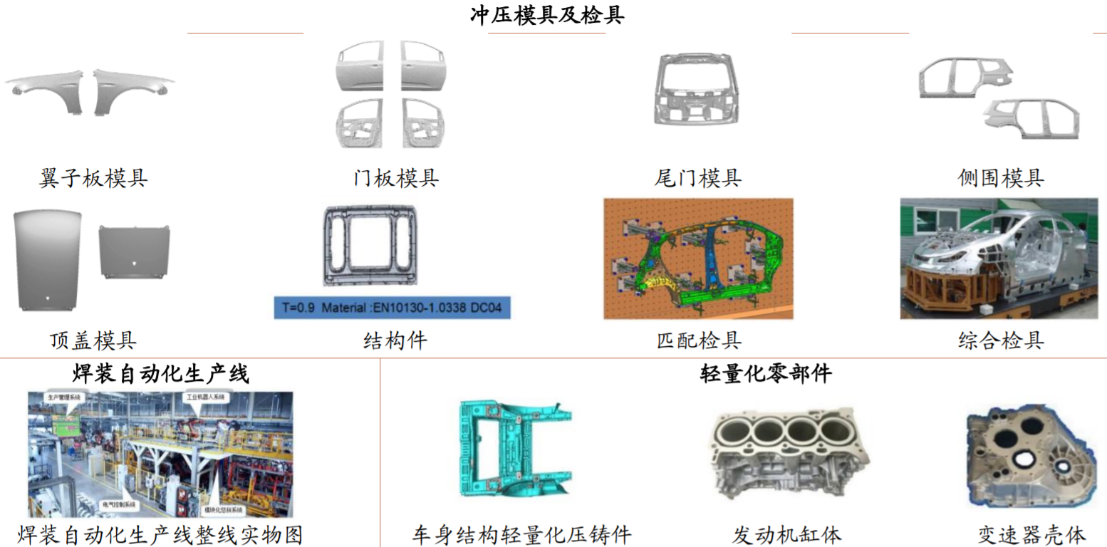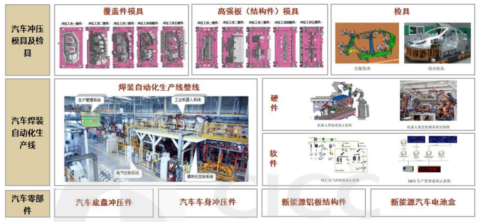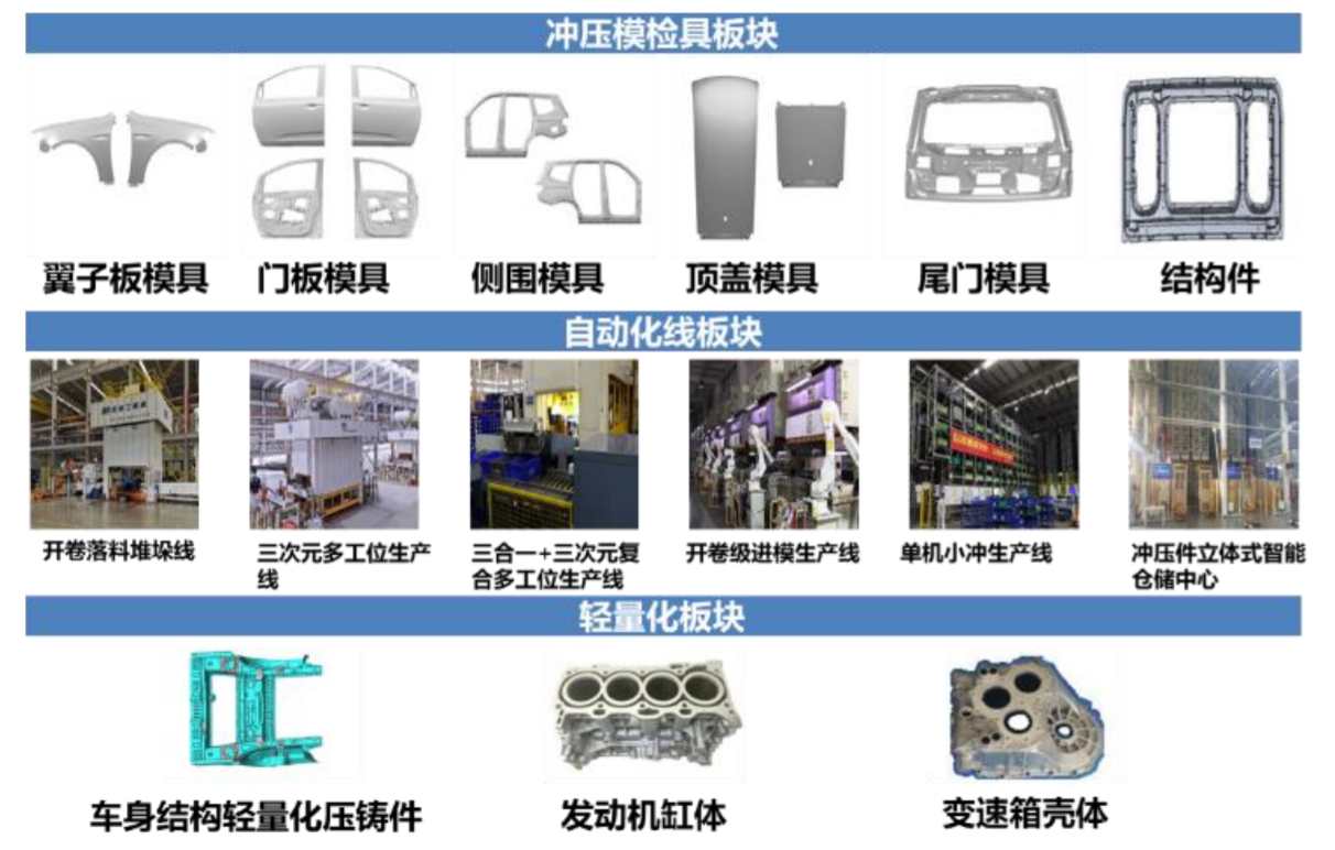 公司三大产品线:模具及检具\焊装自动化生产线\轻量化汽车零部件。