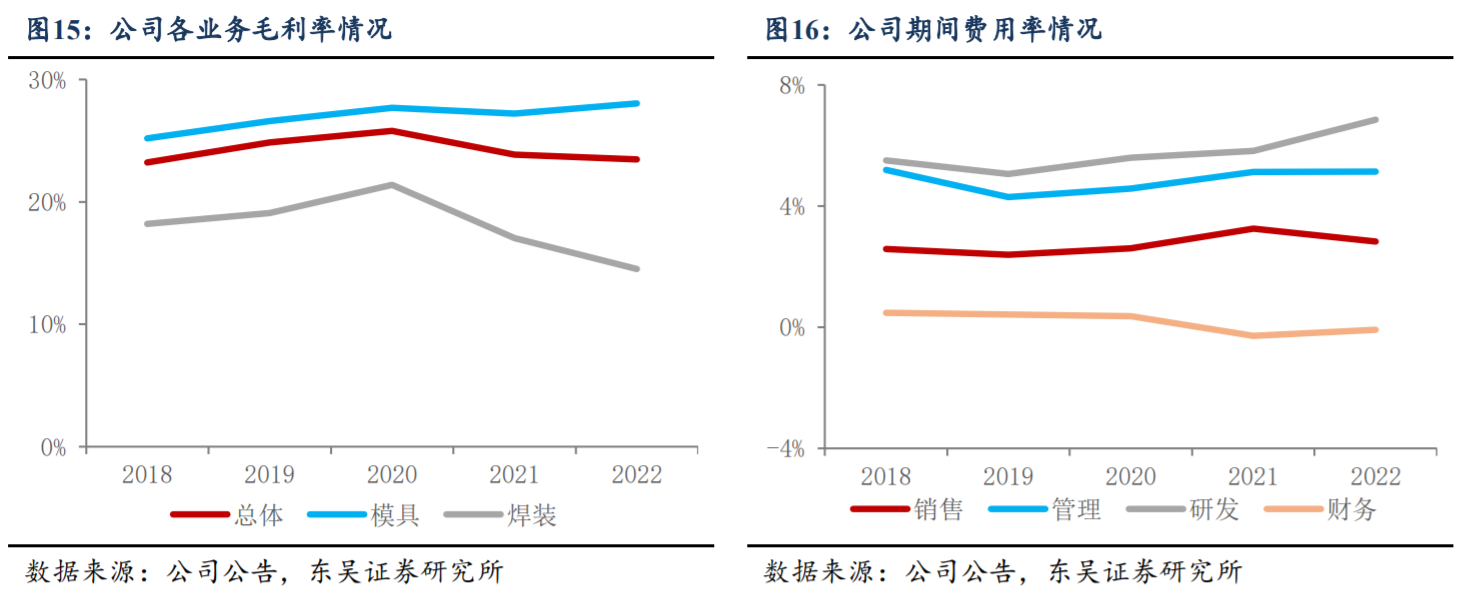 公司模具业务毛利率较高。2022年公司模具业务毛利率为28.1%,高于天汽模(20.3%)、成飞集成(11.4%),比威唐工业低3.9pct,主要系威唐工业客户基本为海外客户,毛利率较高所致。
