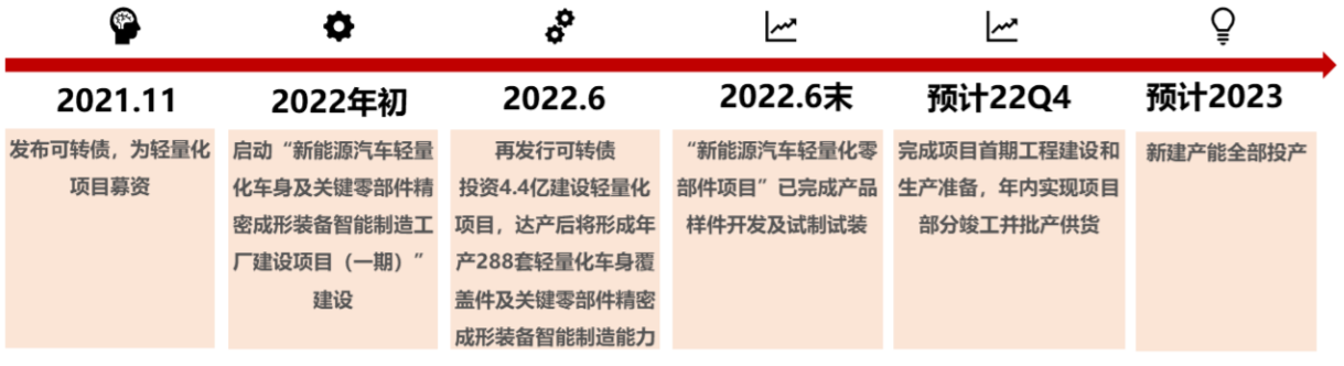 截至2022年,汽车轻量化零部件工厂项目一期实现2条产线批产、2条产线启动安装调试,汽车轻量化零部件业务已批供客户2个、定点开发中客户2个。