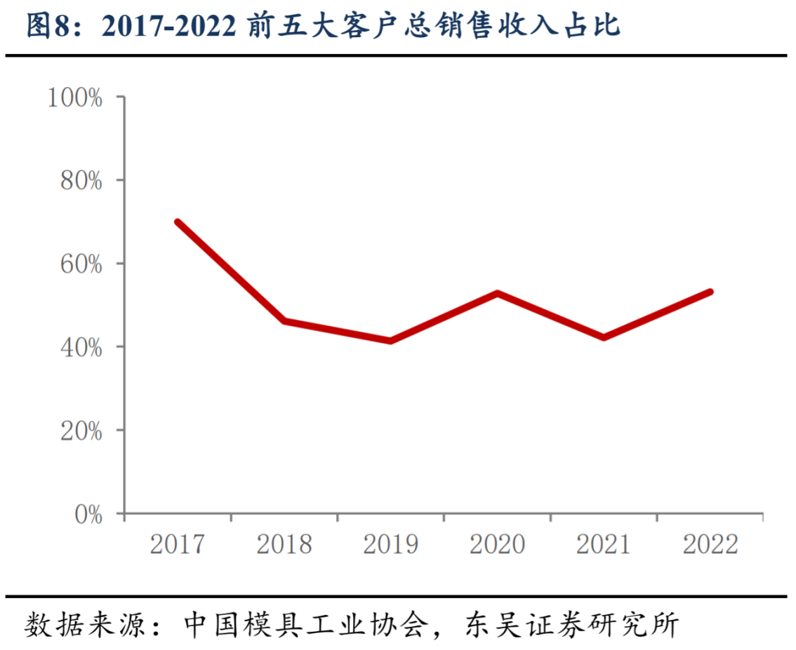 行业整体呈现“小、多、散”的格局,低端市场充分竞争。2021 年汽车冲压模具竞争格局较为分散。
