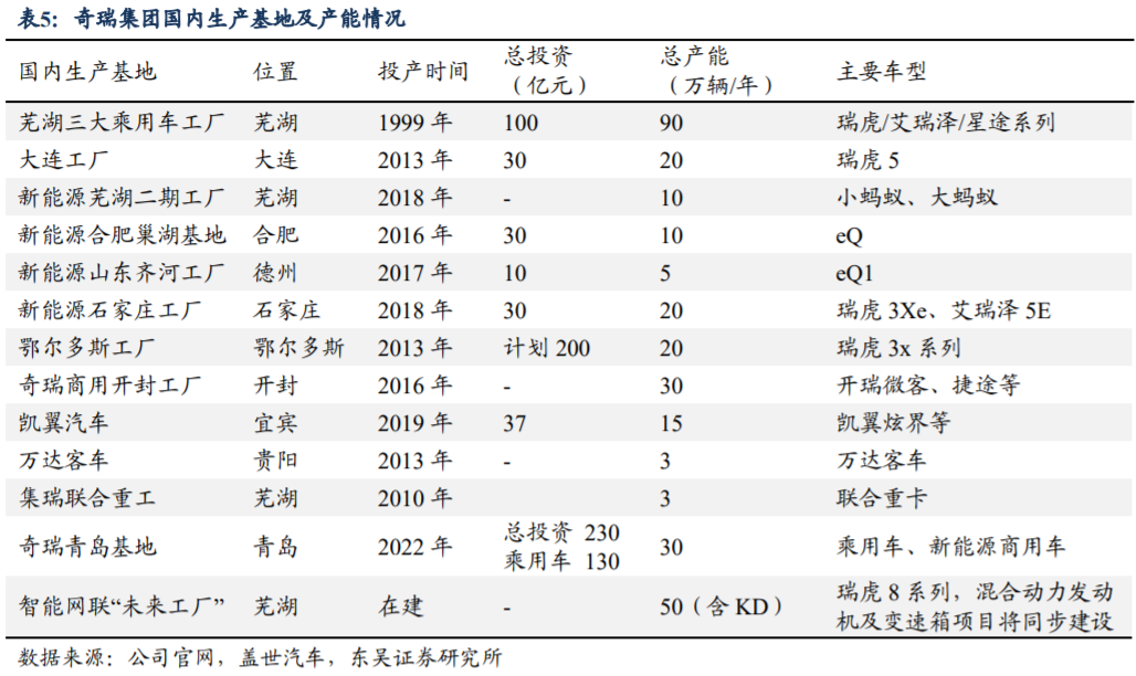 奇瑞集团全球多地布局工厂,规划总年产能约336万辆/年。目前,奇瑞集团在国内芜湖、大连、合肥、德州布局15个工厂,总产能约有306万辆/年,在巴西、马来西亚、俄罗斯、埃及等国家建立了10个工厂,总产能约30万辆/年。奇瑞集团建设在安徽省的产能达113万辆/年,智能网联“未来工厂”投产后,产能将增加50万辆/年,安徽省规划总产能占比48.5%。