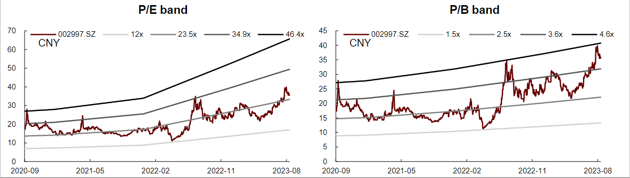 装备业务订单高增,2020/21/22年在手订单分别为20.2/24.6/30.3亿元,2023年上半年新接订单15亿元,同比+30%,目前在手订单35亿元(产线:模具约55:45),有力保障未来收入增长。公司募投产能释放,2022年焊装产线项目一阶段建成并满产,二阶段于2022年中旬启动,保障2023-25年增长。