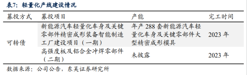 2)汽车轻量化零部件业务根据下游客户的排产计划进行生产,若下游客户车型销量快速增长,则具备较大的营收增长弹性。