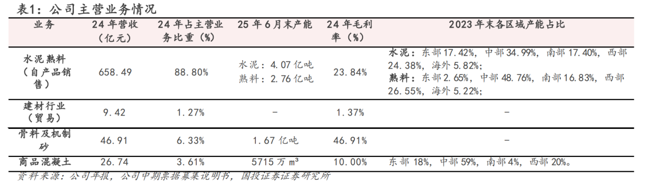 公司主营业务为水泥、商品熟料、骨料及混凝土的生产及销售。公司水泥生产线全部采用先进的新型干法水泥工艺技术,具有产量高、能耗低、自动化程度高等特点,品种主要包括32.5级水泥、42.5级水泥及52.5级水泥,广泛应用于铁路、公路、机场、水利工程等国家大型基建项目、房地产开发和农村市场,产品出口至美国、欧洲、非洲、亚洲等20多个国家和地区。在维持主业竞争优势基础上,公司积极延伸上下游产业链,加快推进重点骨料项目建设投产,围绕撬动主业的战略定位布局商混产业,快速发展干混砂浆等消费建材产业。截至2025年6月末,公司拥有熟料产能2.76亿吨,水泥产能4.07亿吨,骨料产能1.67亿吨,在运行商品混凝土产能5,715万m³,在运行新能源发电装机容量845兆瓦。