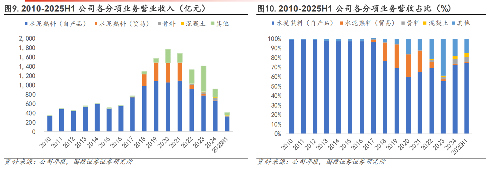 水泥熟料主业承压,骨料业务快速成长,其他业务营收波动较大。2010-2017年,公司水泥熟料自产品销售收入占比维持在95%以上,2017年为强化终端市场建设,公司战略转型开展水泥熟料贸易业务,2018-2021年此业务营收规模约250-410亿元,营收占比约22%,2021年后受水泥市场需求下行影响,公司大幅收缩盈利水平较低的水泥熟料贸易业务,2024年公司水泥熟料自产品销售收入658.49亿元(yoy-15.51%),水泥熟料贸易收入9.42亿元(yoy-60.02%),合计营收占比约73.4%。此外,为延伸上下游产业链,公司布局骨料和商混业务,骨料营收从2013年的0.23亿元增长至2024年的46.91亿元(yoy+21.40%),商混营收由2017年的0.01亿元增长至2024年的26.74亿元(yoy+18.64%),2024年两者营收占比分别为5.15%和2.94%。公司其他业务包含新能源、环保、外部物流、出售废旧物资及利用大宗材料供销渠道服务客户所开展的煤炭等非水泥熟料贸易业务,2024年其他业务营收168.74亿元(yoy-69.09%)。