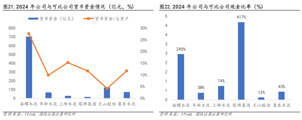 水泥龙头经营韧性突出,行业下行龙头地位提升。公司为安徽省国资控股水泥龙头,经营实力突出,业务范围全国布局,截至2024年末,公司水泥产能4.03亿吨/熟料产能2.74亿吨,水泥及熟料产能位居国内第二,为世界最大的单一品牌供应商。公司经营韧性突出,2002年上市以来,各季度均实现盈利,货币资金储备充足,“高现金低负债”构筑深厚护城河。2021-2024年,受房地产需求下滑、疫情、基建投资放缓等多因素影响,水泥需求大幅收缩,价格竞争激烈,行业进入下行阶段,各公司水泥业务整体呈量价齐跌态势,公司凭借其规模、成本、市场资源优势,维持盈利优势,同时实现市占率逆势提升。