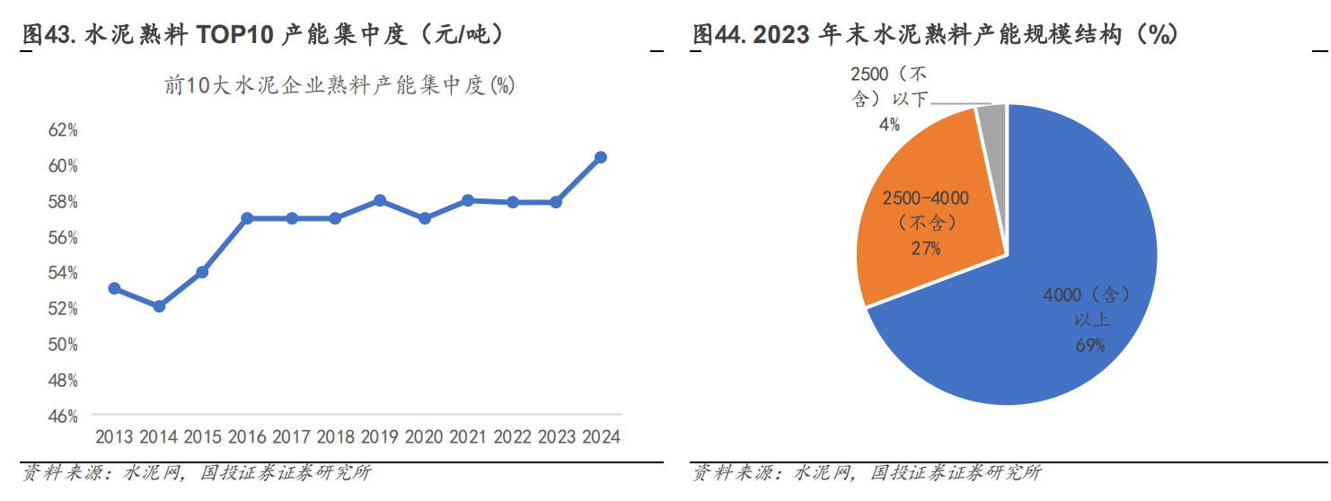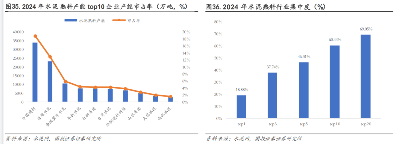 截至2024年底,我国水泥熟料产能为17.93亿吨,我国水泥企业多以区域性经营为主,除中国建材为全国布局外,其他各企业均为集中在局部地区开展业务,具备区域性龙头属性,且产能规模排名前三的企业均为央国企控股公司。截至2024年,水泥熟料产能规模排名第一企业为中国建材,年产能为3.39亿吨,市占率为18.88%,其次为海螺水泥和冀东水泥,年产能分别为2.33亿吨和1.05亿元,市占率分别为12.98%、5.87%。若观察水泥行业集中度,2024年,水泥熟料产能top1、top3、top5、top10、top20企业合计市占率分别为18.88%、37.74%、46.31%、60.44%、69.05%,行业集中度相对较高。