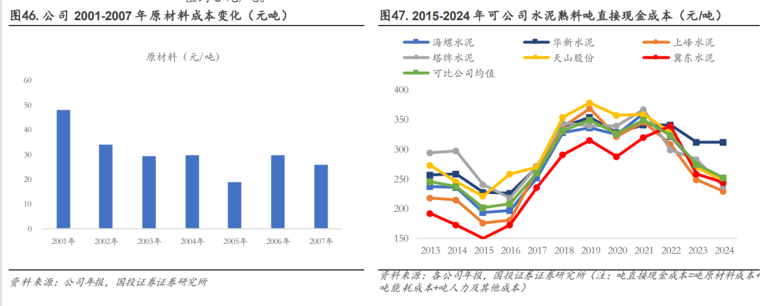 T型布局创造资源/运输优势,直接现金成本领先同行。依托T型布局,公司在长江沿岸石灰石资源丰富的地区兴建熟料基地,石灰石矿山原料成本低廉,水泥粉磨环节靠近市场,并且临近电厂、码头等配套设施,助力生产和运输成本管控,显著改善成本数据。2001-2007年,公司单吨原材料成本呈现较为明显的下降,由47.78元/吨降至25.60元/吨。T型布局一定程度造就了公司长期成本优势,若观察公司和可比公司的直接现金成本(原材料+燃料动力+人工+其他),2015-2024年公司水泥熟料吨直接现金成本均低于可比公司均值,平均低于可比公司约7-18元/吨,2024年公司水泥熟料吨直接现金成本约171元/吨,低于可比公司均值约8元/吨。