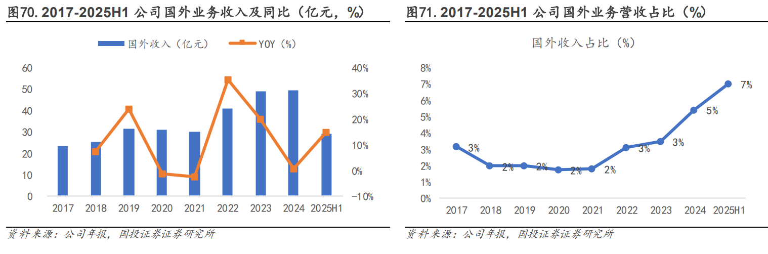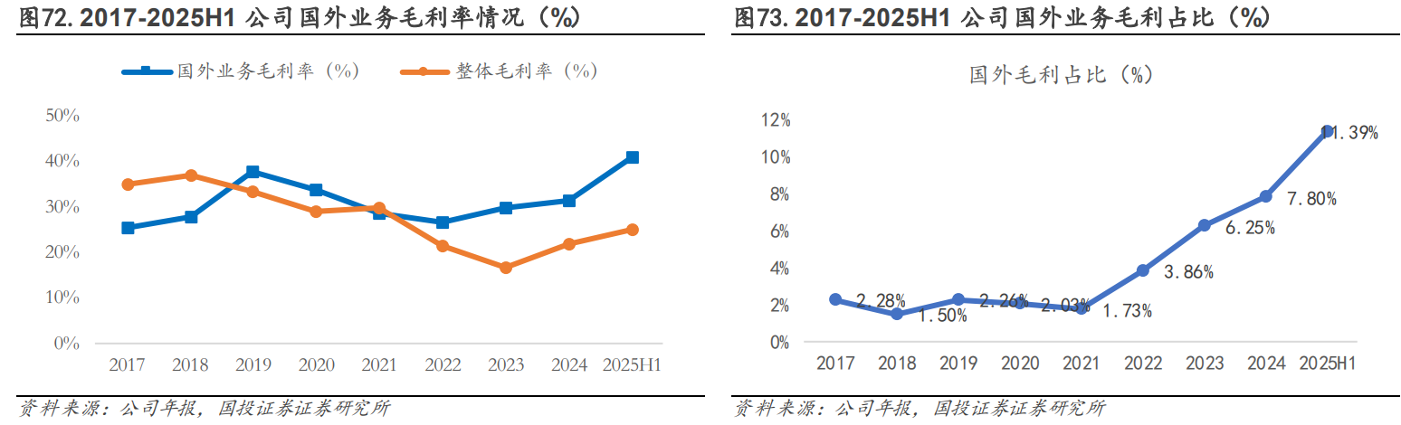 国外营收快速增长,毛利率高于整体水平。2017-2024 年公司国外营收及占比均呈上升趋势,营收由 23.59 亿元增长至 49.37 亿元,CAGR 达 11.12%;营收占比由 3.13%增长至 5.42%。多数年份下,公司海外业务毛利率水平高于整体盈利,2022 年至今,国内水泥下游需求疲盈利下滑,海外业务毛利率相对稳定,维持在30%左右水平,2024年,公司海外业务毛利率31.23%,高出公司整体毛利率(21.70%)9.53pct,2021-2024 年公司海外业务毛利润占比由 1.73%快速提升至 7.80%。随公司持续推进海外业务布局,其销售规模有望进一步增长,高毛利率业务增厚业绩,支撑公司盈利水平改善。