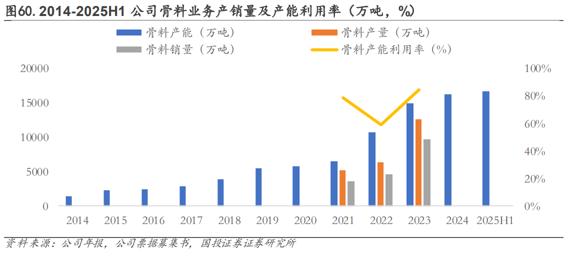 高毛利率骨料增厚业绩,一体化布局提升综合竞争力。骨料业务产能规模持续增加,水泥+骨料联产降低物流与运营成本。在维持主业竞争优势基础上,公司积极延伸上下游产业链,增强市场竞争力和控制力。2011 年,公司在池州建成第一条年产 150 万吨骨料项目,早期项目集中于于安徽(铜陵、池州)、广东(英德)等水泥主业优势区,与水泥主业形成协同效应,降低初期投资风险;2018 年后公司骨料业务产能加速扩张,向江西(分宜)、广西(兴业)、湖南(江华)等中西部省份延伸,通过并购或新建实现资源卡位,如 2022 年 19 个项目同步投产,覆盖多省份。公司多数骨料项目与水泥生产基地配套(如芜湖建科),发挥“水泥+骨料”联产优势,降低物流与运营成本。2014-2024 年,公司骨料业务产能由 1440 万吨/年大幅增长至 1.63 亿吨/年,CAGR 高达 27.46%,2024 年产能较 2014 年增加 10.3 倍。2025 年,公司预计全年新增骨料产能 1960 万吨,随公司骨料业务产能规模持续攀升,有望助力公司营收/业绩进一步增长。