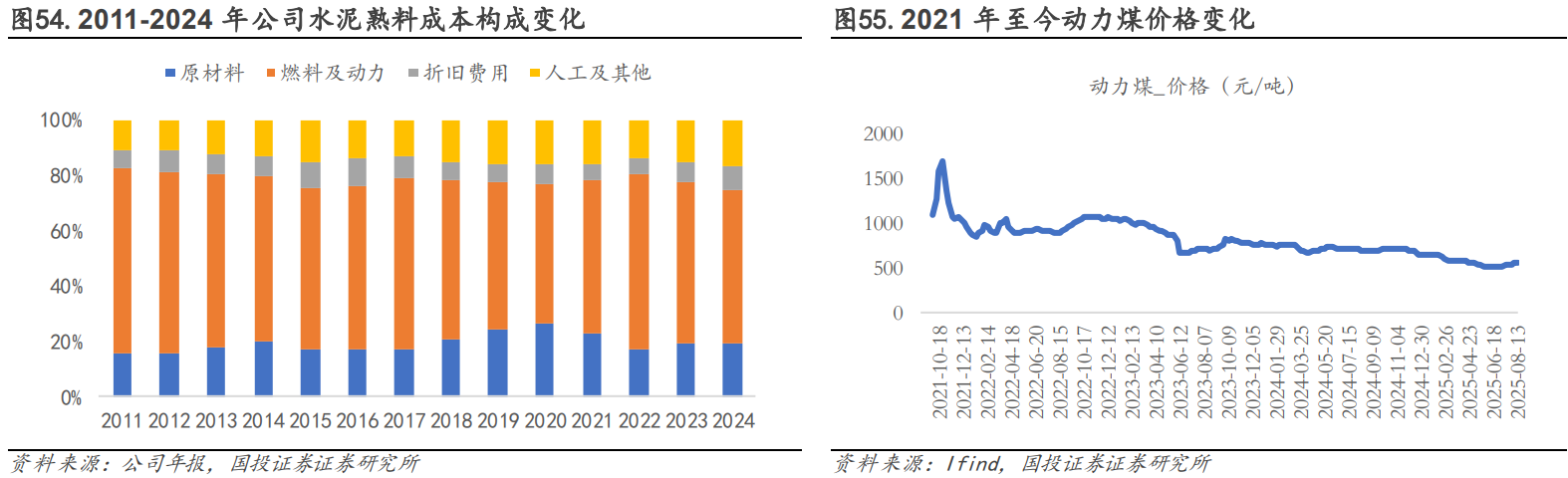 公司营业成本拆分分析:燃料及动力成本占比较高,原材料成本相对稳定。公司水泥产品营业成本中,燃料及动力成本各年占比均超 50%,原燃料采购价格波动对公司生产成本影响较大,2024 年至今,动力煤价格持续下降,公司原燃料成本占比同比下降 2.99pct 至 55.41%。为减轻煤炭价格波动对公司生产成本影响,公司深化与大型煤企战略合作,保障煤炭供应稳定性和经济性,同时提升替代燃料使用比重,全面降低采购成本。水泥生产原料主要包括石灰石及粘土、粉煤灰、石膏、矿渣、砂岩及铁粉等,石灰石、粘土及砂岩主要为公司自有矿山开采供应,其他原材料外购,2018-2024 年,公司水泥熟料自产品原材料成本在 36-46 元/吨之间,占营业成本比重约为 18-26%。公司折旧费用主要和产品生产效率相关,2011-2020年,水泥熟料自产品折旧费用 11-13 元/吨,2021 年以来或由于需求承压公司产能利用率下降,公司折旧费用有所提升,由 2020 年的低点 12 元/吨提升至 2024 年的 16 元/吨。