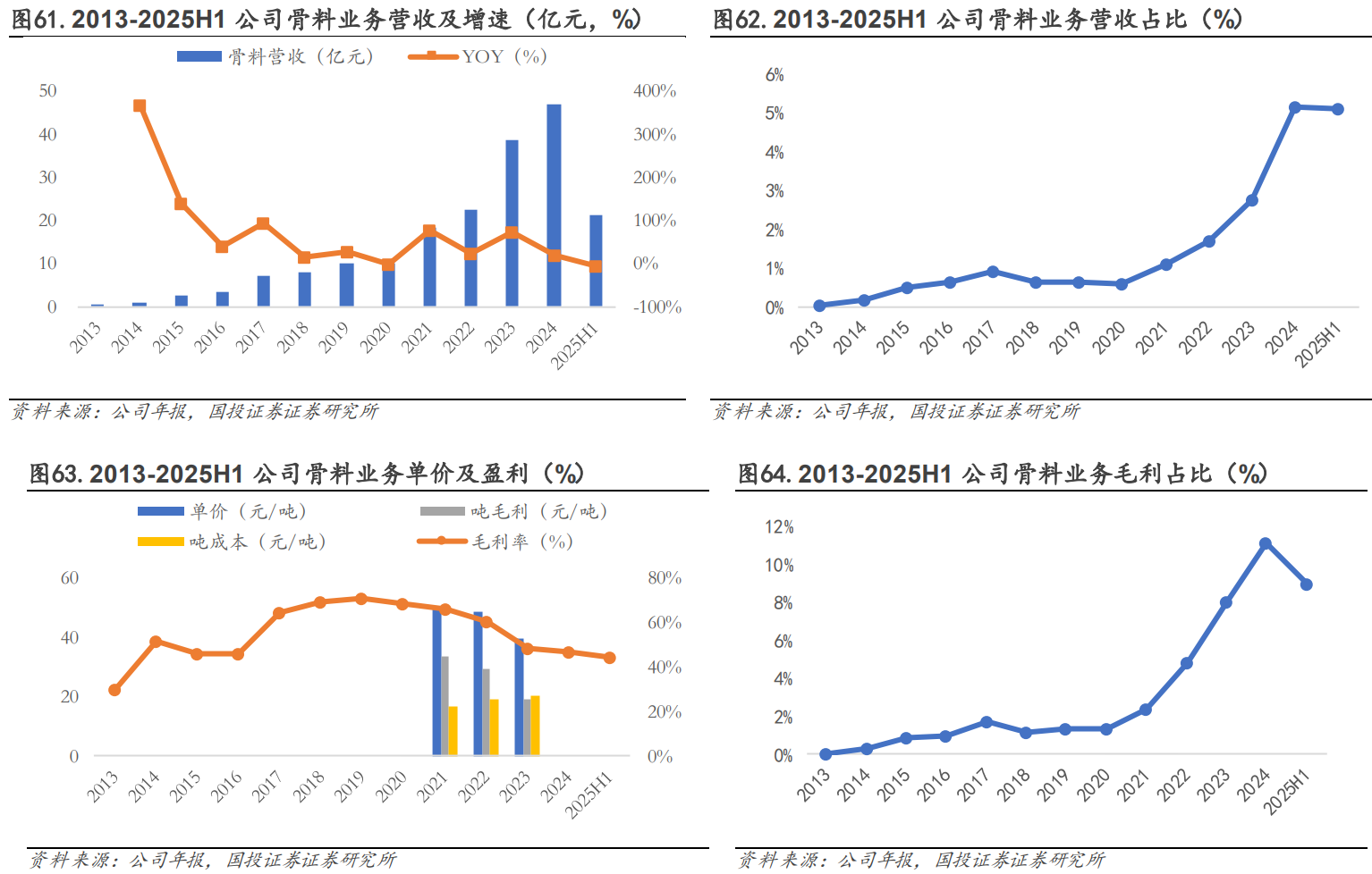 骨料为高毛利业务,毛利润占比快速提升。公司骨料业务产能规模持续扩张,营收迅速增长,2013-2024 年公司骨料业务营业收入由 0.23 亿元大幅增长至 46.91 亿元(yoy+21.40%),CAGR高达 62.17%。骨料为低价值量产品,2021-2023 年公司骨料均价在 39-50 元/吨之间,2021年至今,或由于下游需求疲软,骨料行业竞争加剧,产品价格和盈利下行,2023 年公司骨料销售均价为 39.68 元/吨(yoy-17.86%)。但在盈利水平上,相较于水泥业务,公司骨料业务毛利率较高,2014-2024 年其毛利率均超 45%,近几年由于下游需求疲软,骨料盈利能力呈下滑趋势,2024 年毛利率下滑至 46.91%(同比-1.41pct),但仍远高于公司整体毛利率水平(21.70%)。近几年国内水泥熟料经营业绩承压,高毛利率的骨料业务增厚公司业绩,其毛利贡献快速增长,由 2020 年的 1.36%大幅增长至 2024 年的 11.14%。