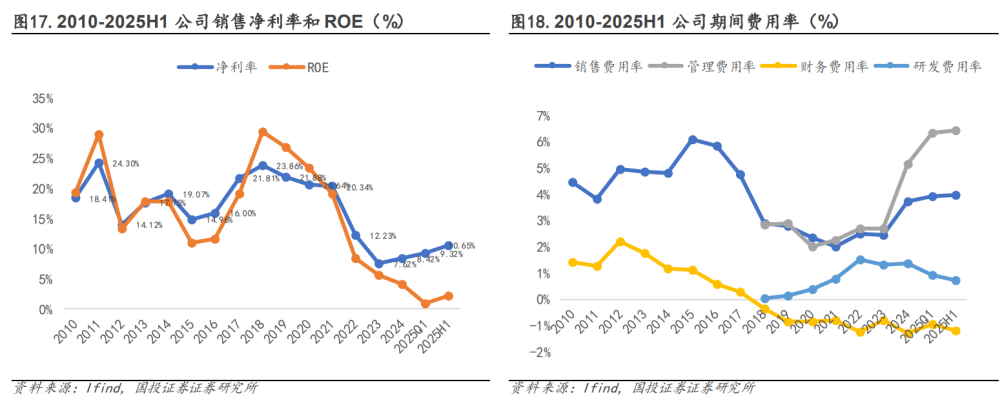 净利率波动较大,营收下降费用率增加。公司净利率基本与毛利率变化趋势一致,2017-2021年维持在20%以上,2022-2023年连续大幅下滑,2023年净利率为7.62%,为2010年以来最低水平,2024年净利率同比提升0.79pct至8.42%。2015-2020年,公司期间费用率持续下降,由13.44%下降至4.23%,其中销售/管理(含研发)/财务费用率分别同比下降3.75pct/3.84pct/1.98pct。2020-2024年,或由于公司营收持续下行,期间费用率同比增加,由4.23%增加至10.38%。
