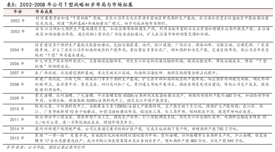 “T型战略”助力市场覆盖范围扩大,从华东拓展到南部、西部等地。2002年上市后,公司开始在安徽省沿江地区大力建设大规模熟料生产基地,部署了铜陵、芜湖等5个千万吨级基地,建设多条日产5000吨以上生产线,沿江熟料产能超7000万吨,同时在江苏、上海等地的20多个城市设立粉磨站。到2008年底,公司熟料产能达8586万吨,水泥产能达9460万吨。2009-2015年,公司持续在长江沿岸加大产能建设,成为当地主导企业,并在西南地区通过新建和收购方式加快产能布局,熟料产能大幅增长,到2015年末,公司熟料产能达2.29亿吨,水泥产能达2.90亿吨,较2008年大幅增长。公司通过T型布局,在产能扩张、市场版图扩大、成本控制等多方面发力,逐步成长为行业领军企业,其利用长江沿岸资源优势建设熟料基地,在沿海及其他市场建立粉磨站,销售区域拓展至东部、南部、西部等区域,不断提升市场份额,巩固市场地位。