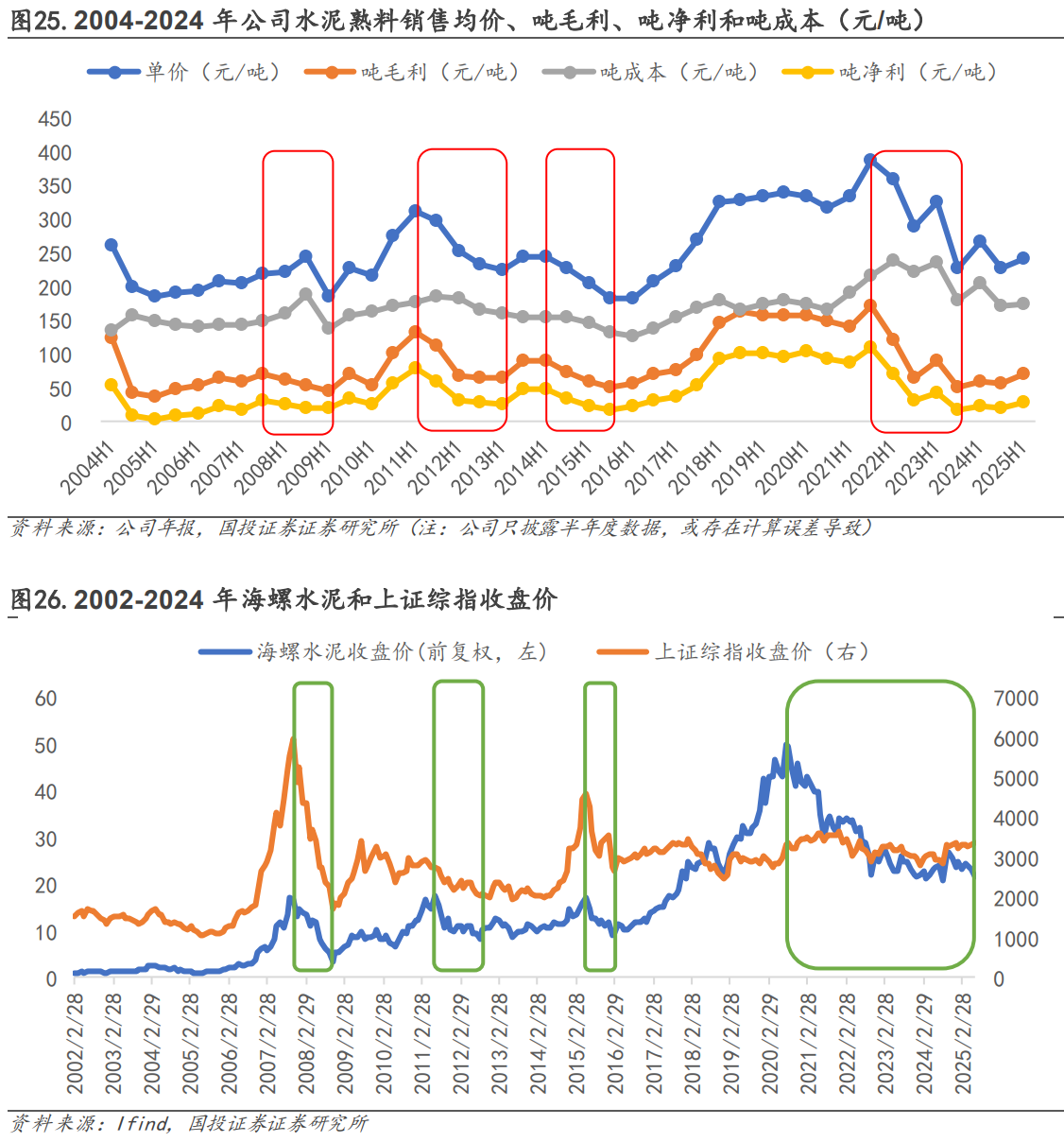 下行周期:2005年至今,水泥行业共经历4次下行周期,每轮周期底部公司水泥熟料吨毛利最低分别为47.13元/吨、64.20元/吨、50.29元/吨、50.21元/吨,吨净利最低分别为20.26元/吨、26.79元/吨、17.23元/吨、17.95元/吨,2024H2公司水泥熟料吨毛利和吨净利分别为56.14元/吨和21.08元/吨,较本轮下行周期最低点高5.93元/吨和3.12元/吨。从下行周期时长来看,四轮下行周期中时间最短为1年半,本轮下行周期已拉长至3年,或主要因上一轮上行周期历时较久,各水泥企业现金流充裕,现金资产规模大幅提升,延缓了市场化出清进程。海螺水泥作为行业龙头,成本优势显著,货币资金充裕,周期底部仍维持盈利能力,且在本轮下行周期中市场份额进一步提升,在行业供给侧改革推进下,公司有望穿越行业下行期,进一步稳固龙头地位,迎来新的发展契机。