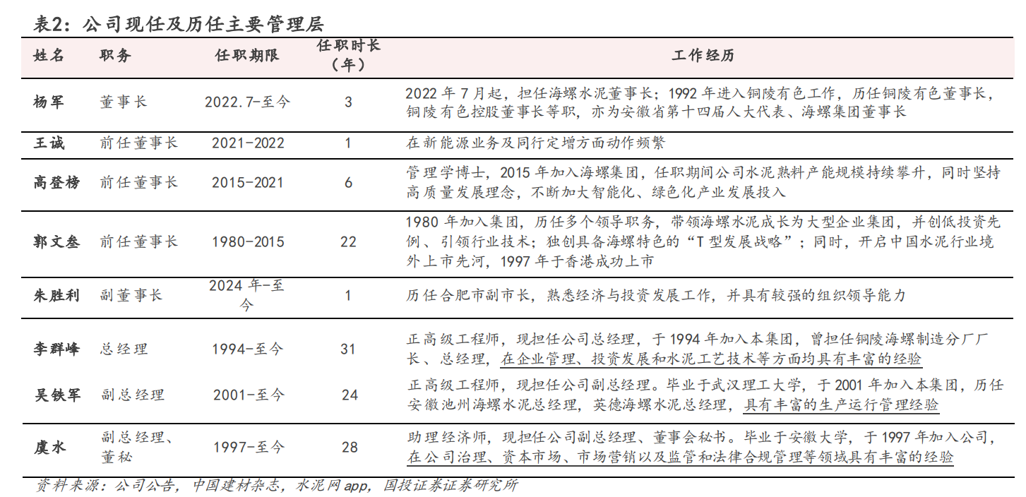 公司发展历经多任管理层,各管理层经营风格存在差异。1993-2015年,郭文叁任职期间展现出颇具开创性风格,主导研发日产万吨级水泥熟料新型干法技术,开创低投资产线先例,并且独创“T型发展战略”,带领公司在香港和A股上市,奠定了海螺水泥的行业龙头地位。2015-2021年,高登榜任职期间,在前期发展经验加持下,公司持续扩张水泥熟料产能,拓展产业链上下游,强化环保和节能减碳,并推动企业迈入国际化进程,公司水泥产能由2.9亿吨增长至3.84亿吨。2022年至今市场需求持续下行,杨军提出份额优先战略,公司凭借规模优势和成本管控能力在缩量市场中抢占市场份额,销量市占率由2021年的12.87%提升至2024年的14.68%(未剔除海外销量的全口径数据计算)。